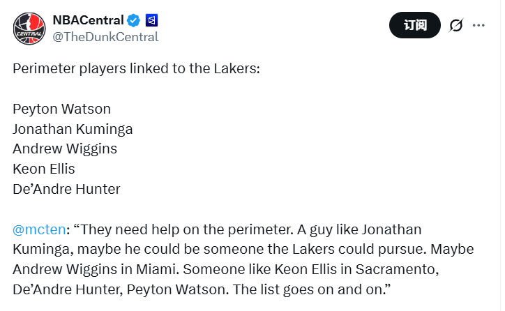 “湖人的外线急需补强。像乔纳森-库明加这样的球员,或许会是球队的追逐目标。还有可能是在迈阿密效力的安德鲁-维金斯。另外,萨克拉门托的基翁-埃利斯,以及德安德烈-亨特、佩顿-沃特森等人也在备选之列。这份潜在引援名单还有很长。”